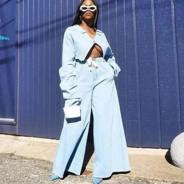 Termékleírás: Alkalmi laza farmer öltöny kétrészes női ruházat