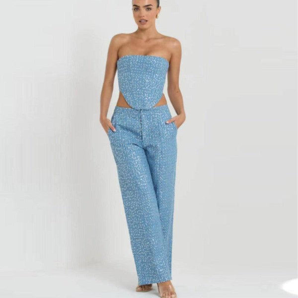 Divat Denim flitteres cső felső széles lábú nadrág öltöny