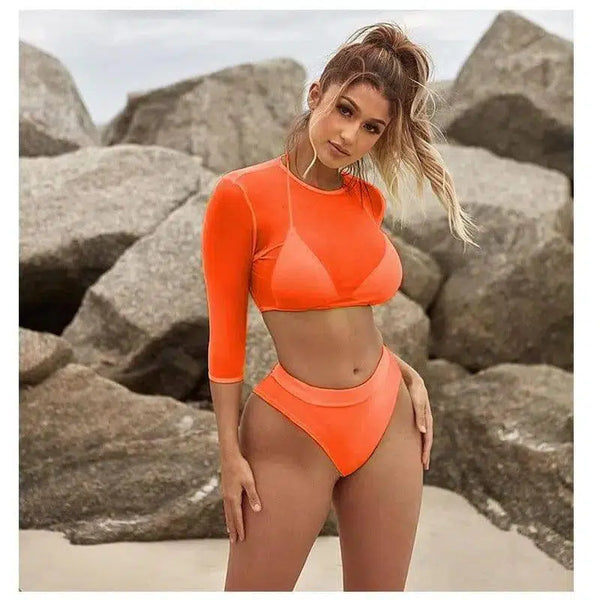 - Kialakítás: Háromrészes szett osztott bikini stílussal