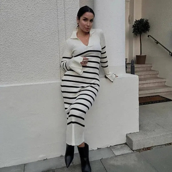 Hosszú ujjú női kötött mély V ruha