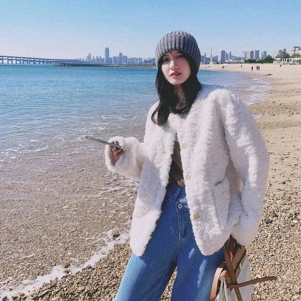 Kerek nyak fém csatt nyúl szőrme kabát nők
