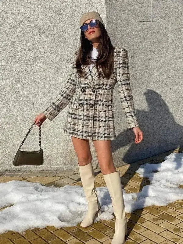 Elegáns tweed kabát és szoknya szett térdig érő csizmával