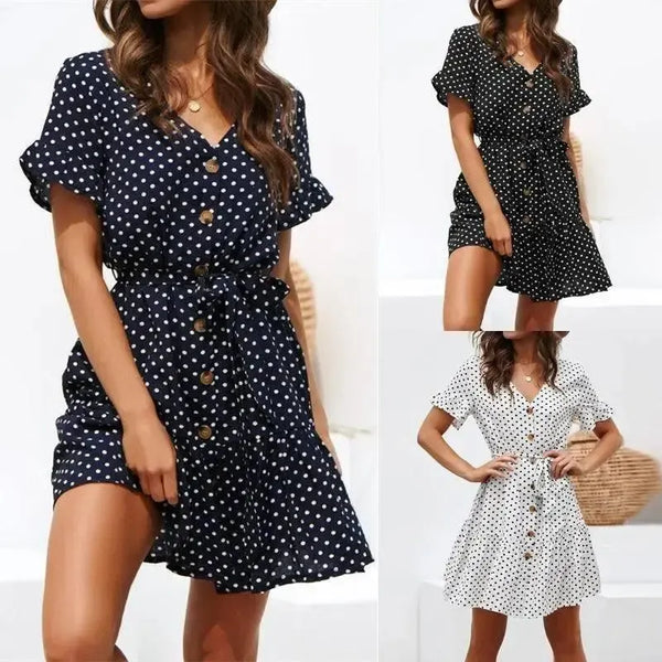 Alkalmi pöttyös, magasított pántos, V-nyakú női sifon ruha
