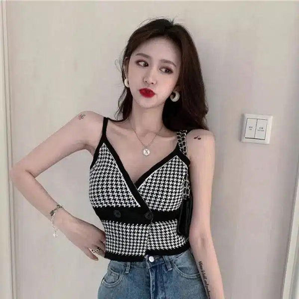 Női Houndstooth V-nyakú ujjatlan felső