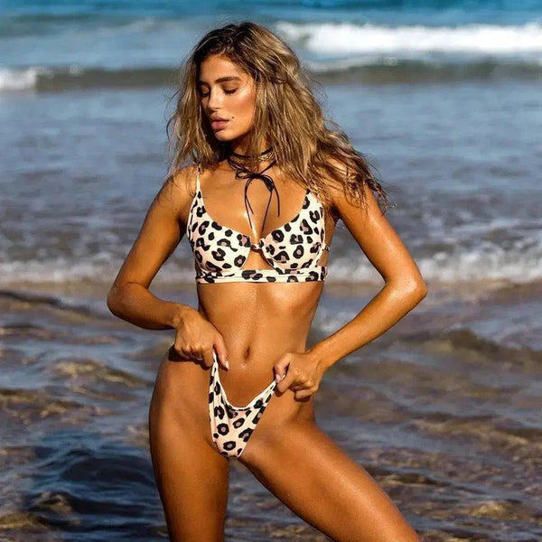 - Vágás: Kétrészes bikini, klasszikus háromszög alakú felső és alsó résszel