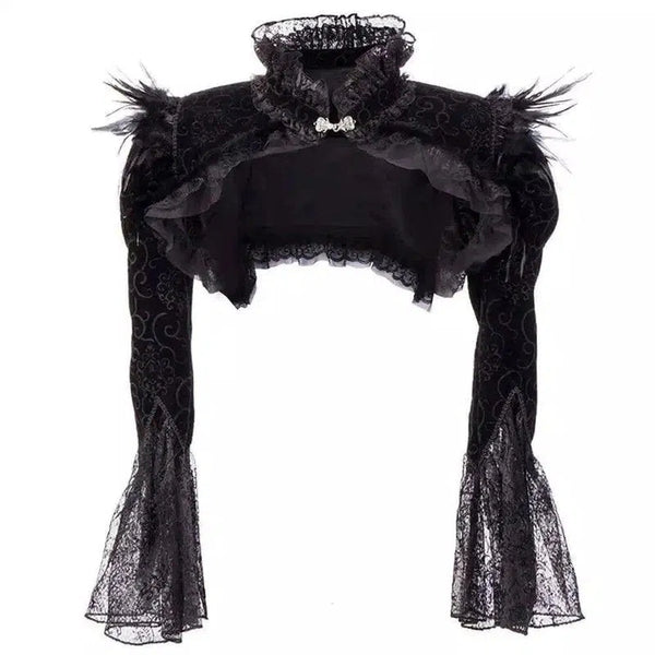 - Nyak vagy vállvonal: Magas csipkegallér tolldísszel