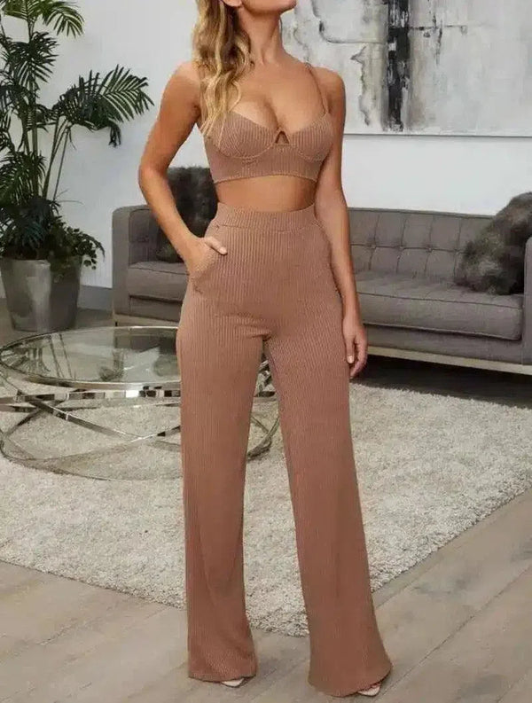 Női bordázott kötött Halter Top és nadrág szett