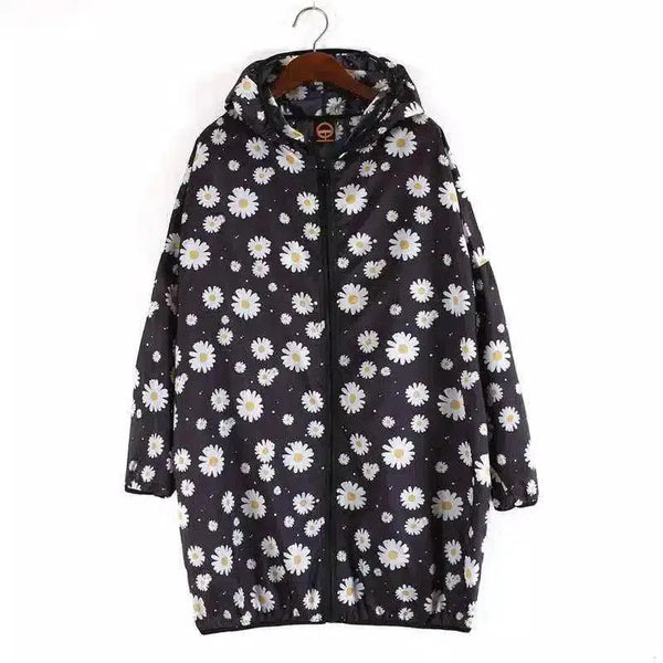 - Bájos százszorszép minta: A kabáton egy elragadó és szemet gyönyörködtető százszorszép minta látható sötét háttér előtt, amely tökéletes egyensúlyt teremt a merész és nőies stílus között.