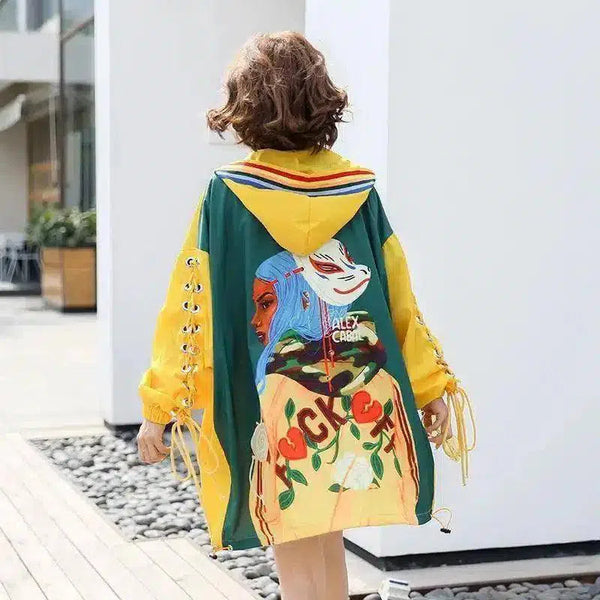 Boldog elemek: A kabát hátulján egy feltűnő, nagyméretű grafika található, amely élénk színekkel és művészi hangulattal a dizájn központi eleme. Az elülső rész visszafogottabb, így a hátoldalon lévő művészeti alkotás kerül a középpontba.