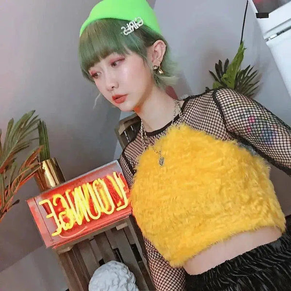 Lány szőrös, vasláncot visel lógó nyakmellényt viselve