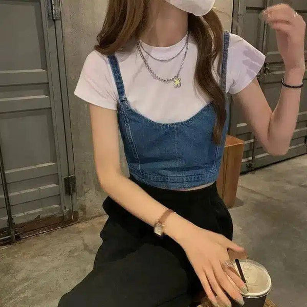 - A ruhadarab típusa: Rétegelt együttes, amely egy farmer crop topot tartalmaz egy alap fehér póló fölött