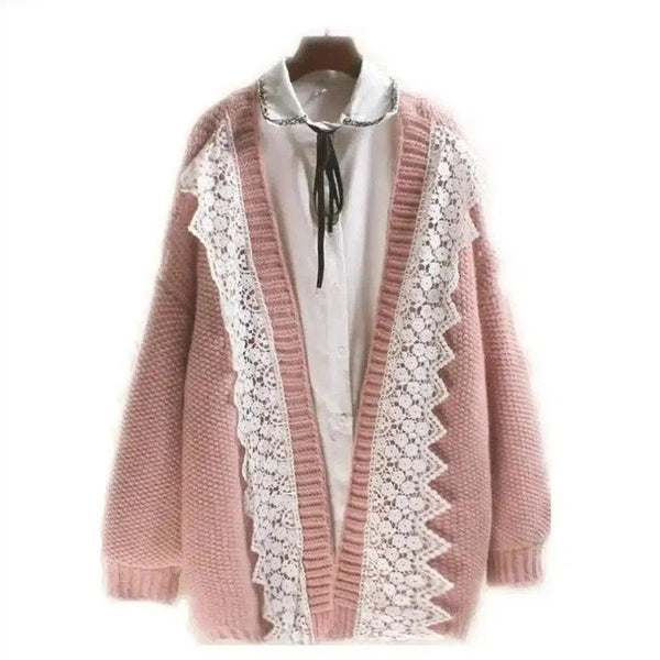 Csipkeszegélyes kötött kardigán nyakkendős blúzzal