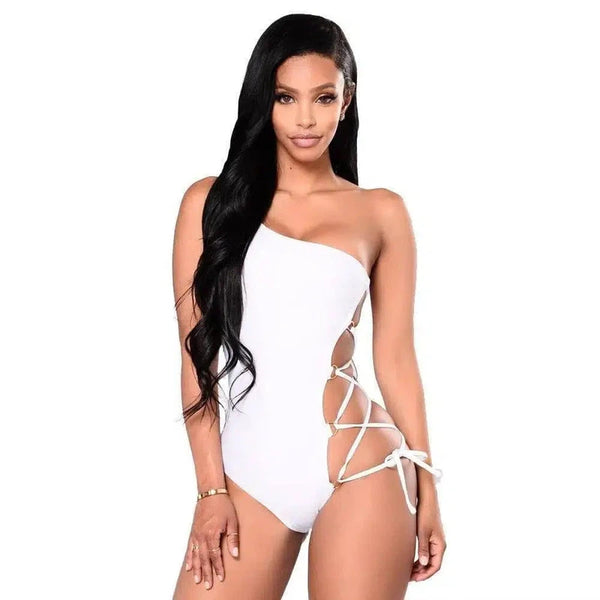 Termékleírás: Egyvállú bikini fürdőruha karika keresztpánttal