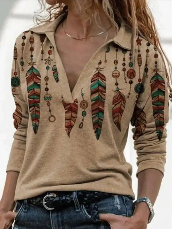 Retro hosszú ujjú, nyomtatott V-nyakú pulóver pulóver