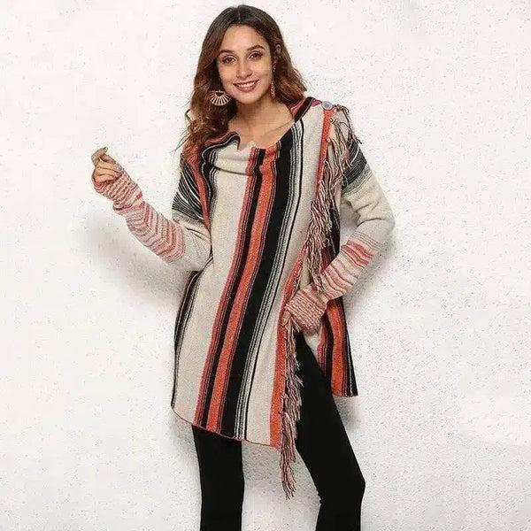 Csíkos női kapucnis kardigán rojtokkal