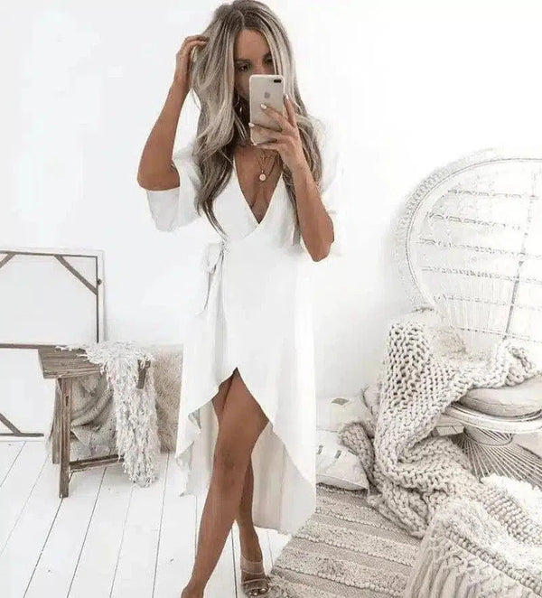 Elegáns V-nyakú, aszimmetrikus szegéllyel ellátott tekercsruha
