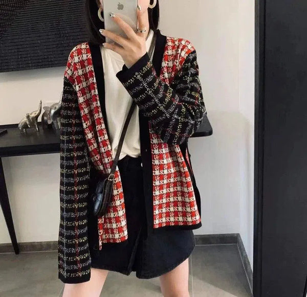 - Kidolgozott mintázat: A blézer klasszikus vadászfogas mintázatot tartalmaz piros és fekete színben, melyet finom fémszálak tarkítanak a csillogás és a csillogás jegyében.