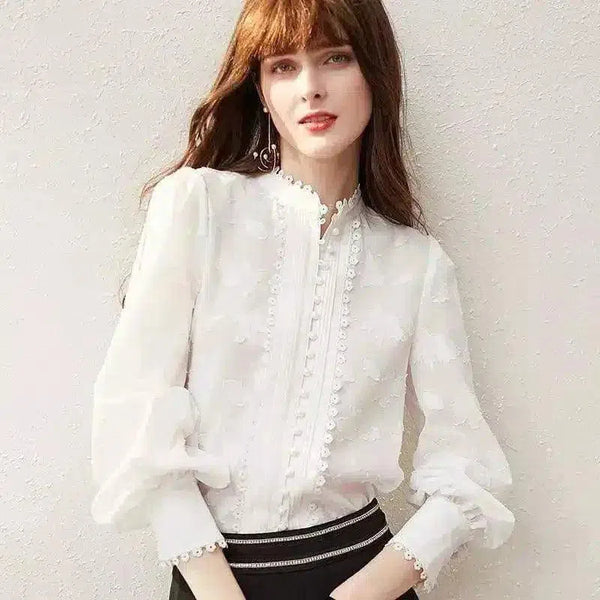 - Finom, fésűs peremek - Az ujjak és a gallér fésűs peremekkel van ellátva, hozzájárulva a blúz bonyolult és kifinomult megjelenéséhez.