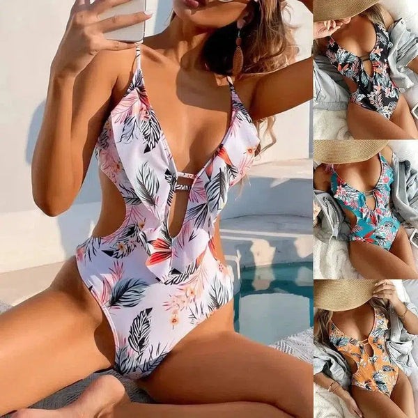 Háromszög egyrészes Leaf Print fodros fürdőruha