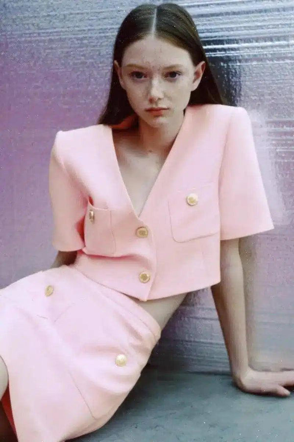 - Details: Aranyszínű gombos hangsúlyok és elülső zsebek a felsőn és a szoknyán