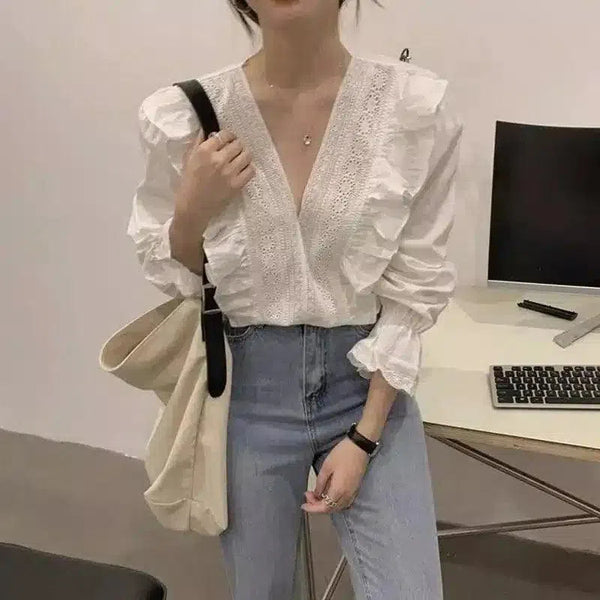 Női csipke szegélyes V-nyakú blúz hosszú ujjú