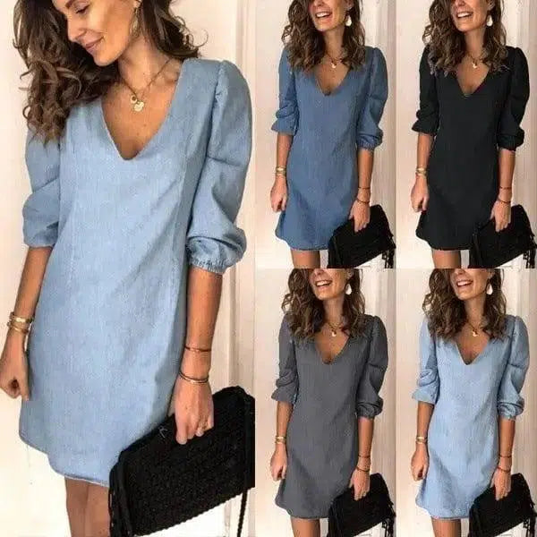 V-nyakú rövid ujjú alkalmi laza pamut és vászon ruha