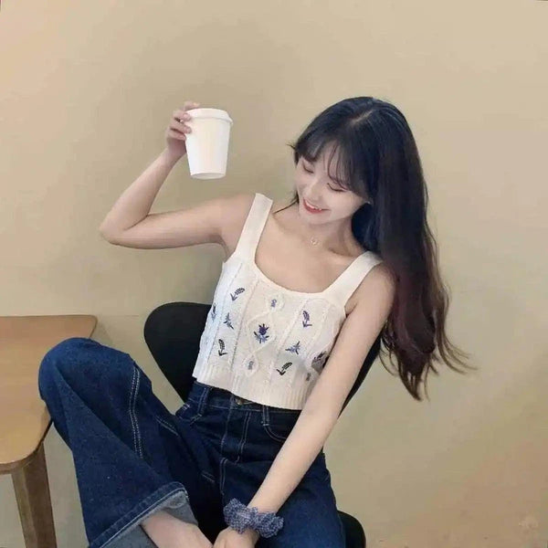 Kötött virágos Crop Top ujjatlan alkalmi viselet