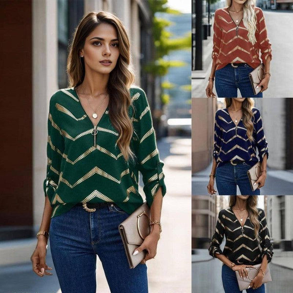 Női alkalmi hosszú ujjú, V-nyakú csíkos ing