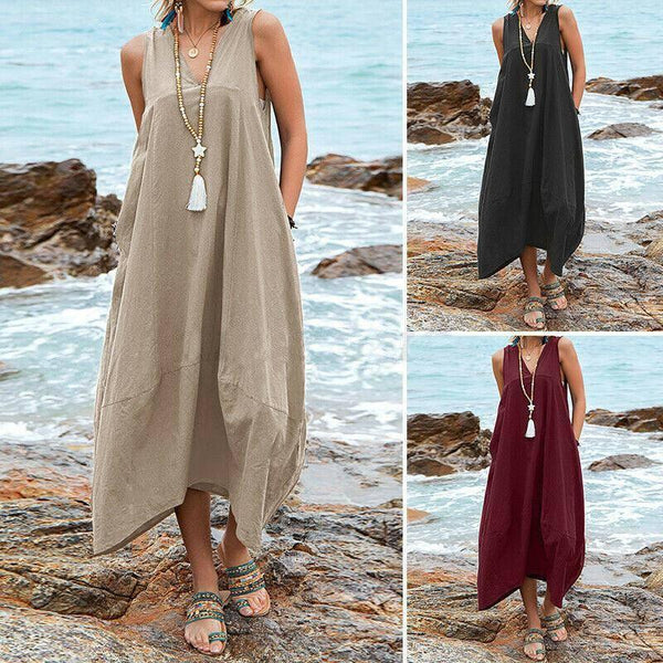 Női pamut és lenvászon V-nyakú zsebes alkalmi ruha