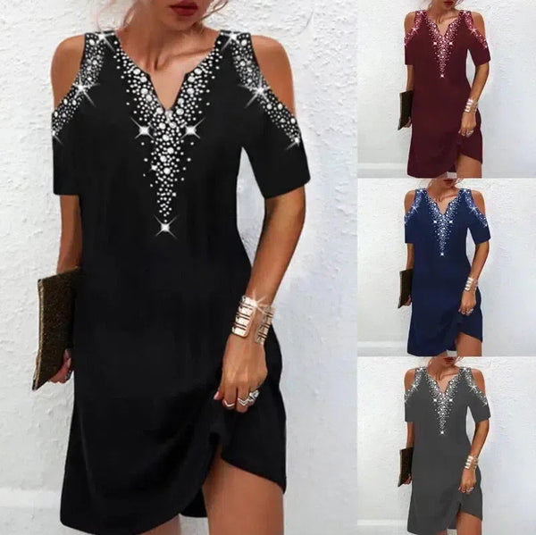 Női V-nyakú, váll nélküli, nyomtatott, rövid ujjú ruha