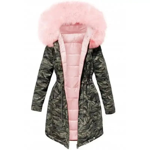 Plüss vastag kabát laza nagy szőrme gallér középhosszú Camouflage