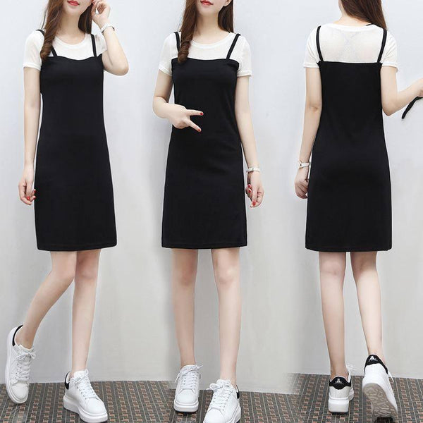 Rövid ujjú közepes hosszú hamis két darab függeszték ruha nyár