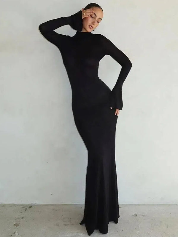 Masszív hát nélküli maxi ruha - trombitaujjú estélyi viselet