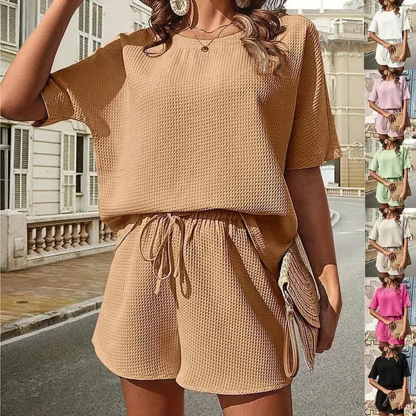 Új Waffle Suit Női denevér ujjú rövid ujjú Crew-nyakú felső és zsinórral kialakított rövidnadrág Divatos kétrészes nyári ruházati szett